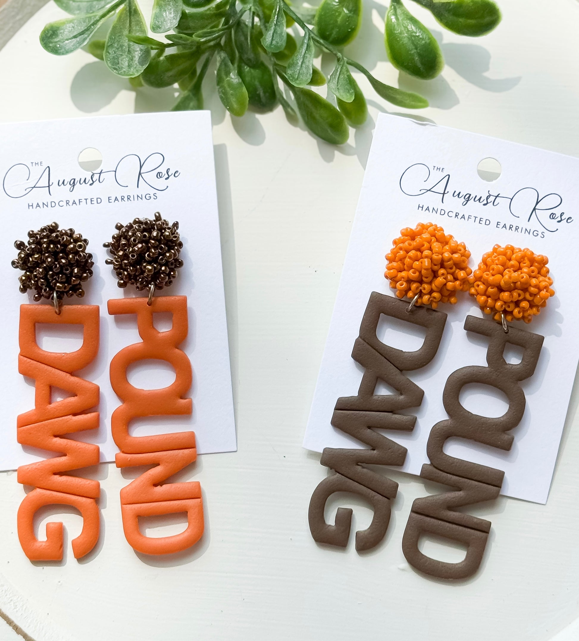polymer clay, orange letters/brown top or brown letters/orange top , approximately 3 inches long